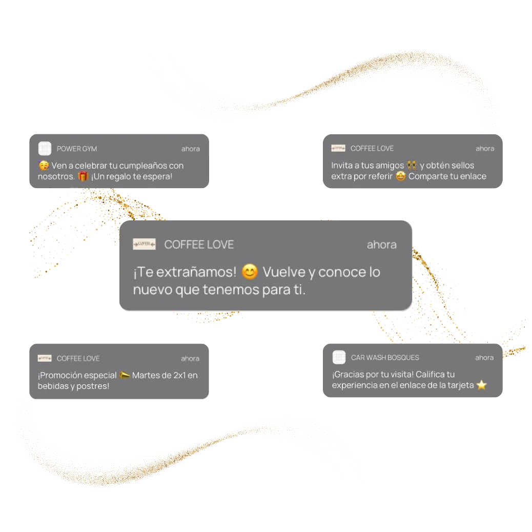 Estas tarjetas digitales ofrecen una manera perfecta para generar una relación duradera y cercana con tus clientes mediante el envío de notificaciones a sus celulares.